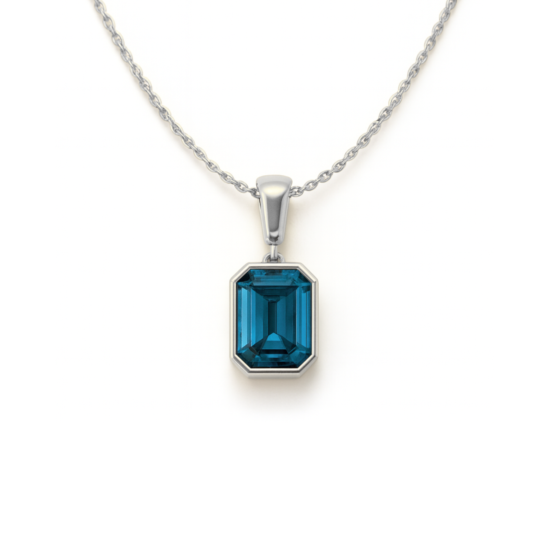 A sleek and modern London Blue Topaz pendant featuring a 3 carat emerald cut natural topaz gemstone in a clean, minimalist bezel setting. Crafted in solid 14K gold, this elegant necklace is perfect for everyday wear and makes a striking December birthstone gift. Choose the pendant alone or pair it with a matching 14K rope cable chain secured with a lobster clasp. Available in 14K White, Yellow, or Rose Gold.