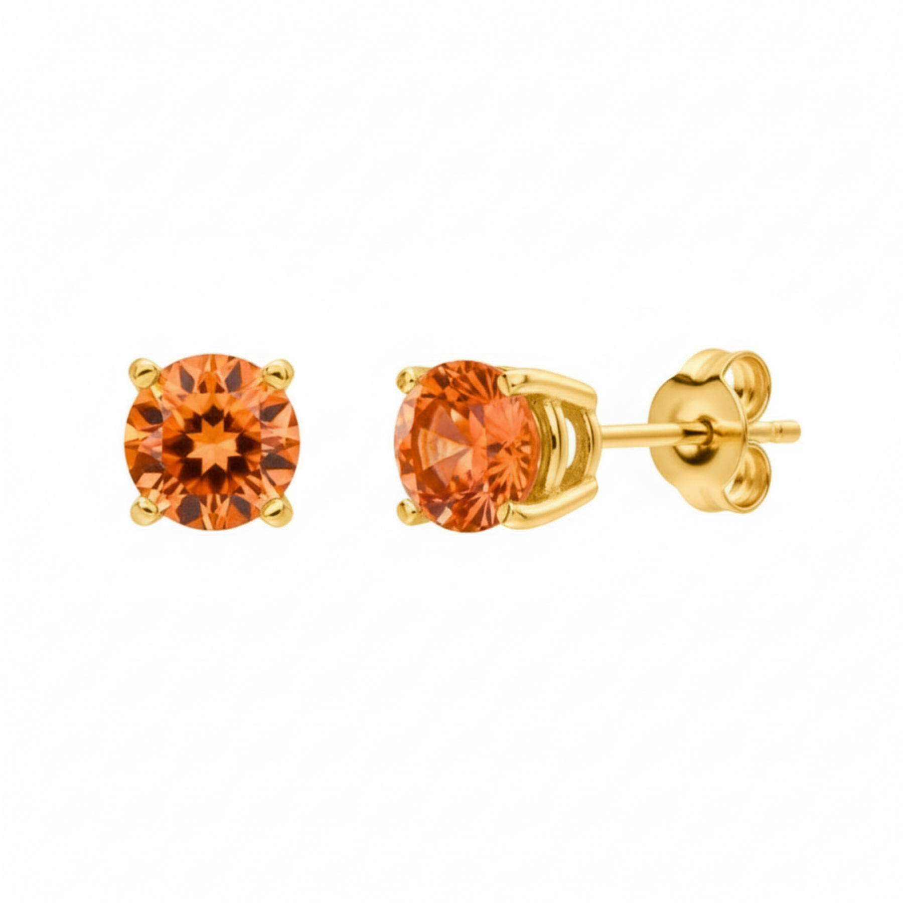 A simply stunning pair of round natural Orange Topaz earrings, showcasing a vivid hot orange color with rich sunrise tones ranging from golden-amber to deep fiery orange. Each gemstone is set in classic 4-prong gold stud mountings with standard posts and friction backs. Available as a single earring or a pair, perfect for both men and women. Choose from 14K White, Yellow, or Rose Gold.