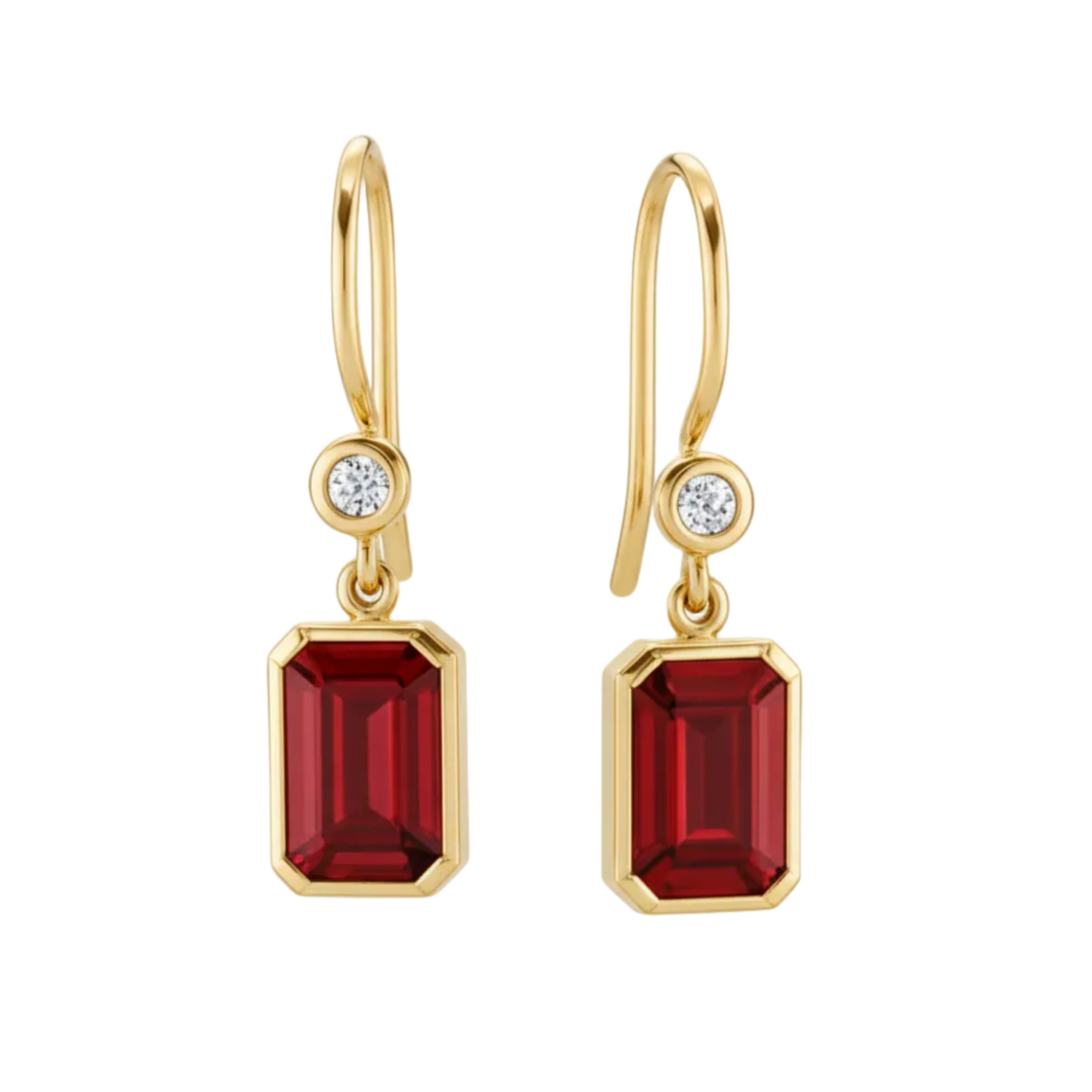 Emerald cut ruby earrings in 18K Yellow Gold bezel set Ruby drop earrings with Diamonds, July Birthday gift idea | Rare Earth Jewelry