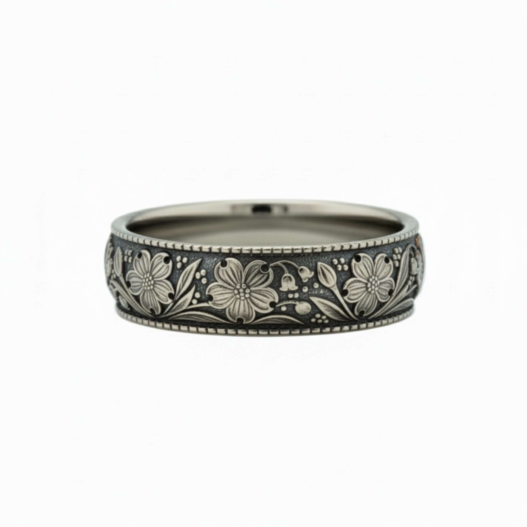 A beautifully detailed dogwood wedding band featuring an engraved botanical design inspired by the delicate blossoms of the dogwood tree. The pattern wraps continuously around the ring, showcasing full dogwood flowers, budding blooms, and flowing leaves set against a textured background for depth and contrast.