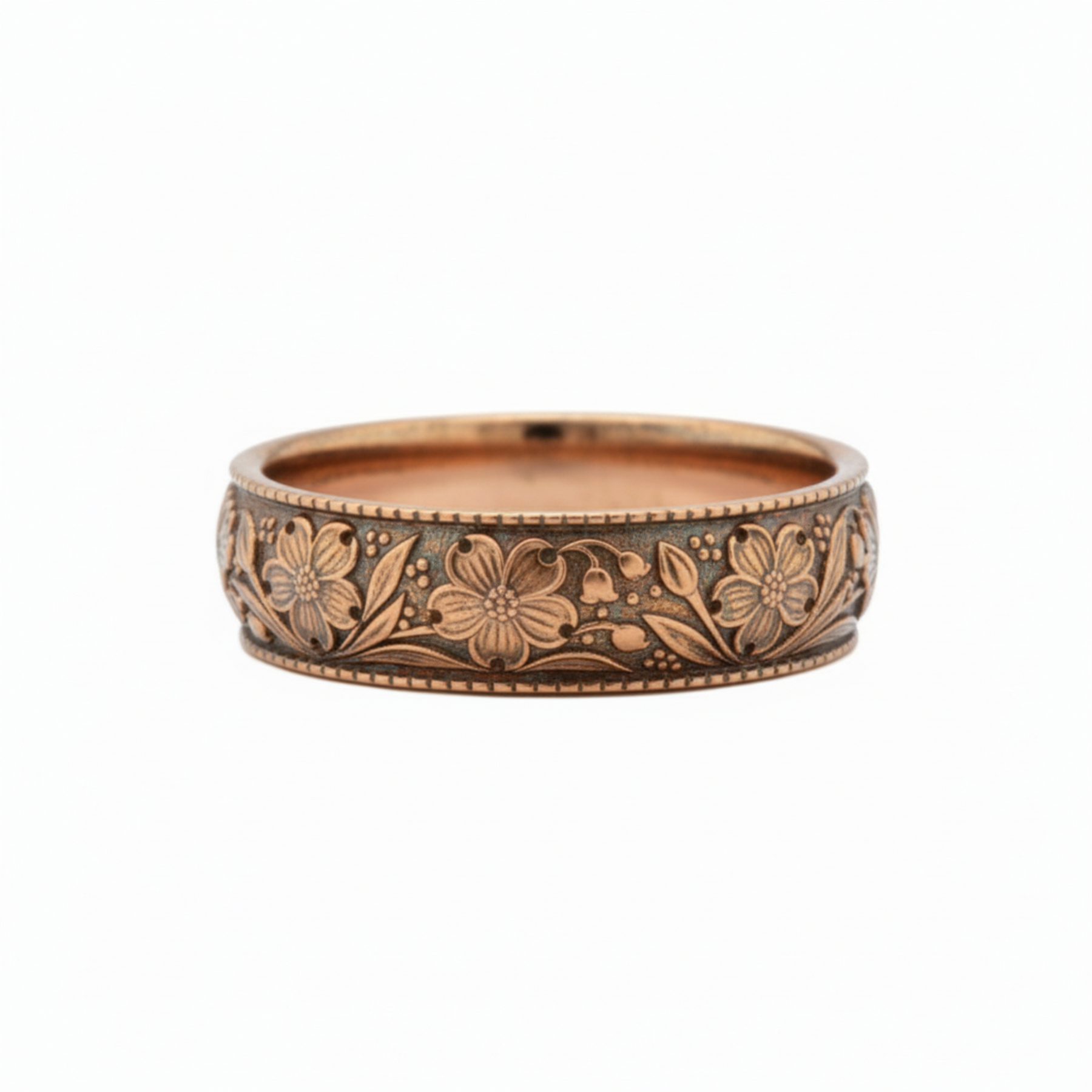 Dogwood blossom wedding band in 14K rose gold with oxidized antique finish, engraved floral and leaf design wedding ring | Rare Earth Jewelry