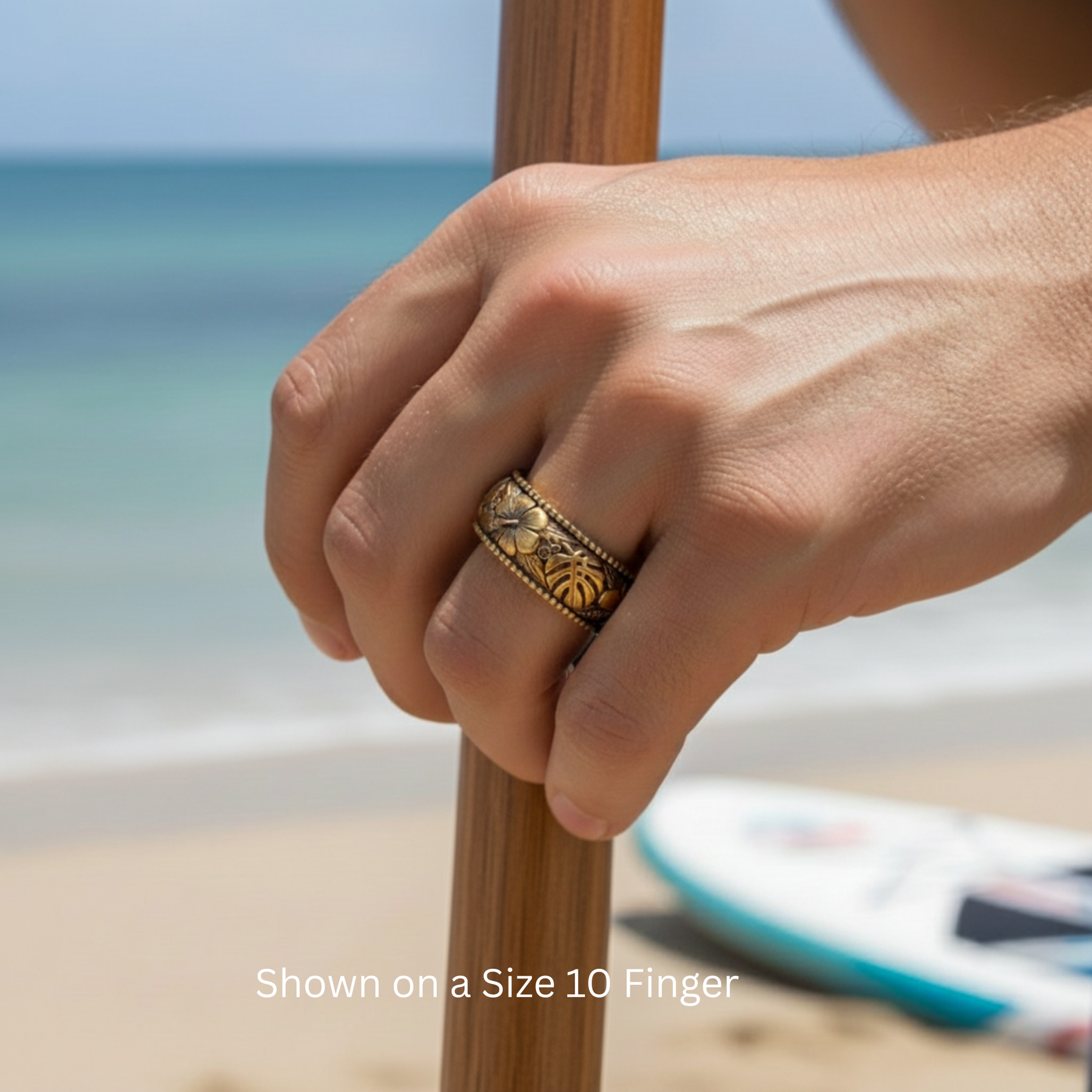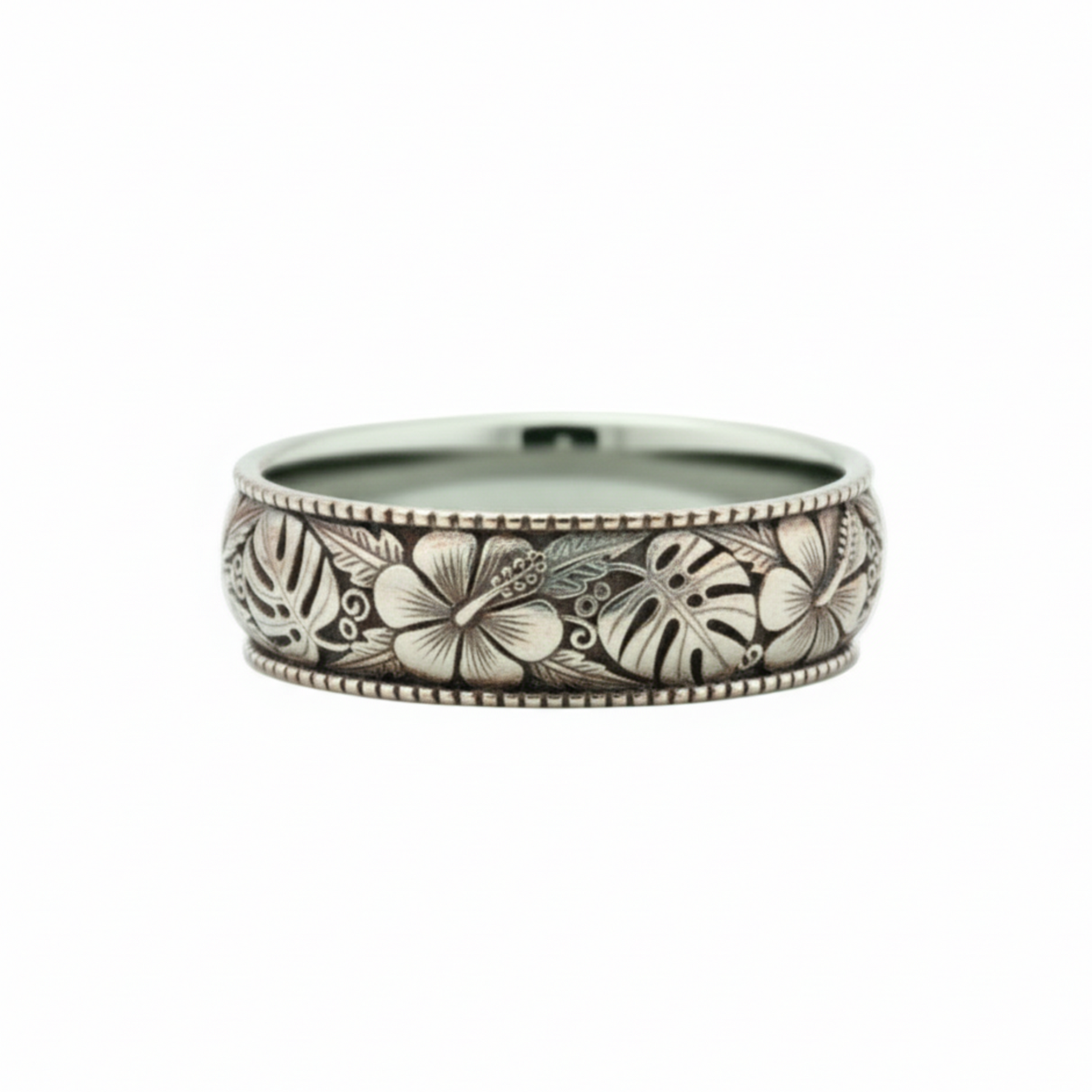A beautifully detailed Hawaiian wedding band featuring engraved hibiscus flowers and bold monstera leaves in a flowing tropical botanical design. The pattern wraps continuously around the ring, showcasing sculpted petals, lush foliage, and organic vine-like curves set against a textured background for depth and contrast. Inspired by Hawaiian flora and vintage hand-engraved motifs, this 8mm tropical flower band offers a striking blend of elegance, island symbolism, and artisan craftsmanship. Perfect for men or women who love meaningful botanical jewelry with a Hawaiian or tropical aesthetic.