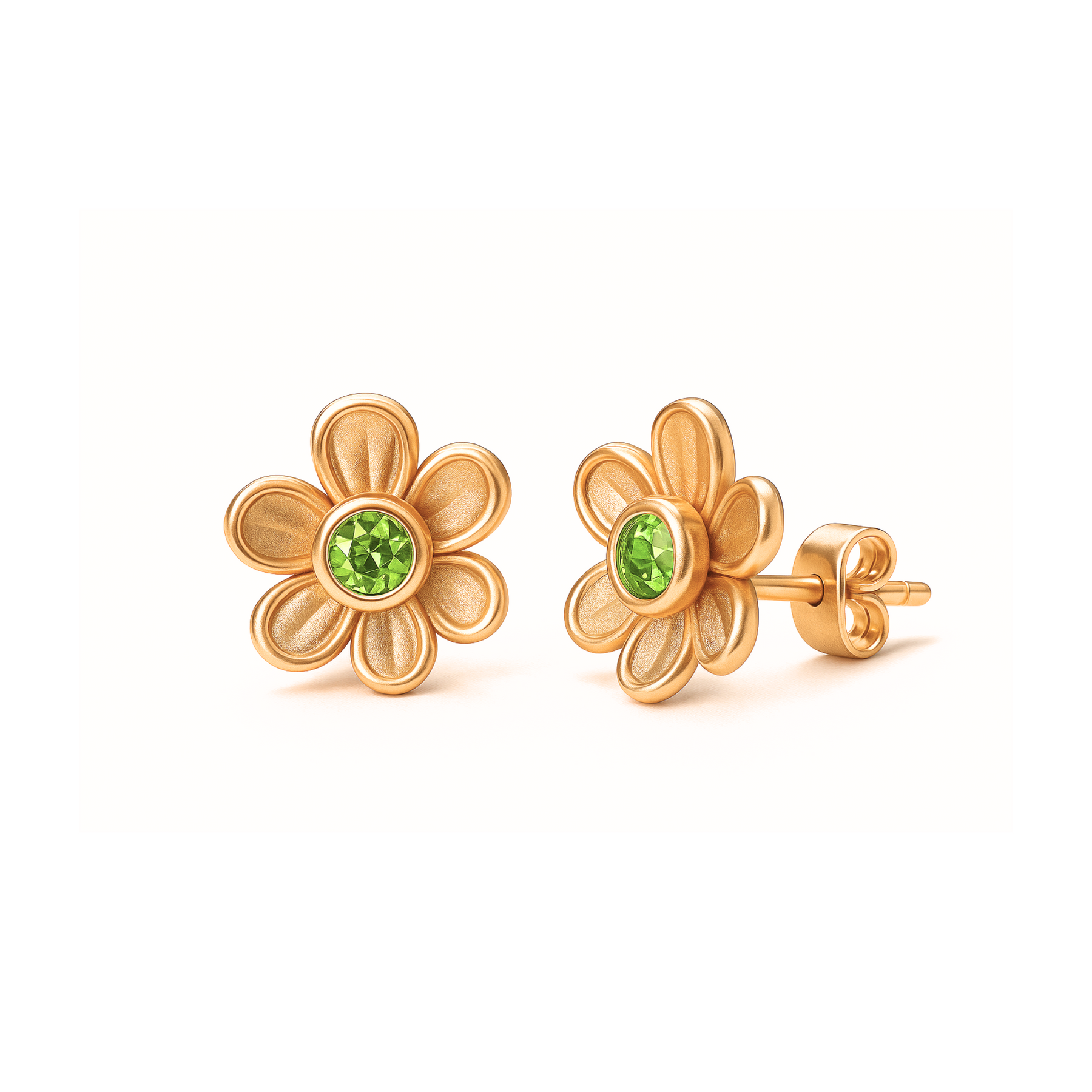 Elegant and timeless, these small peridot stud earrings feature natural green gemstones in a charming flower-shaped design. Measuring 8.5 mm in diameter, these August birthstone earrings are crafted in your choice of solid 14K or 18K white, yellow, or rose gold. Designed with standard posts and secure friction backs, they’re comfortable for everyday wear.