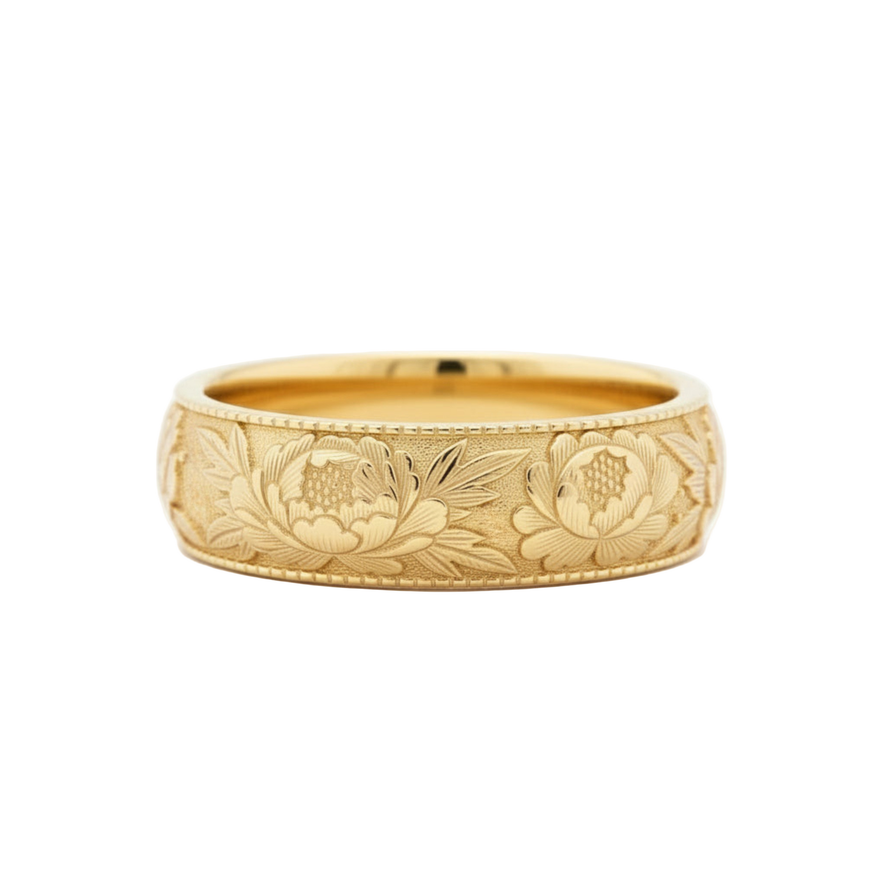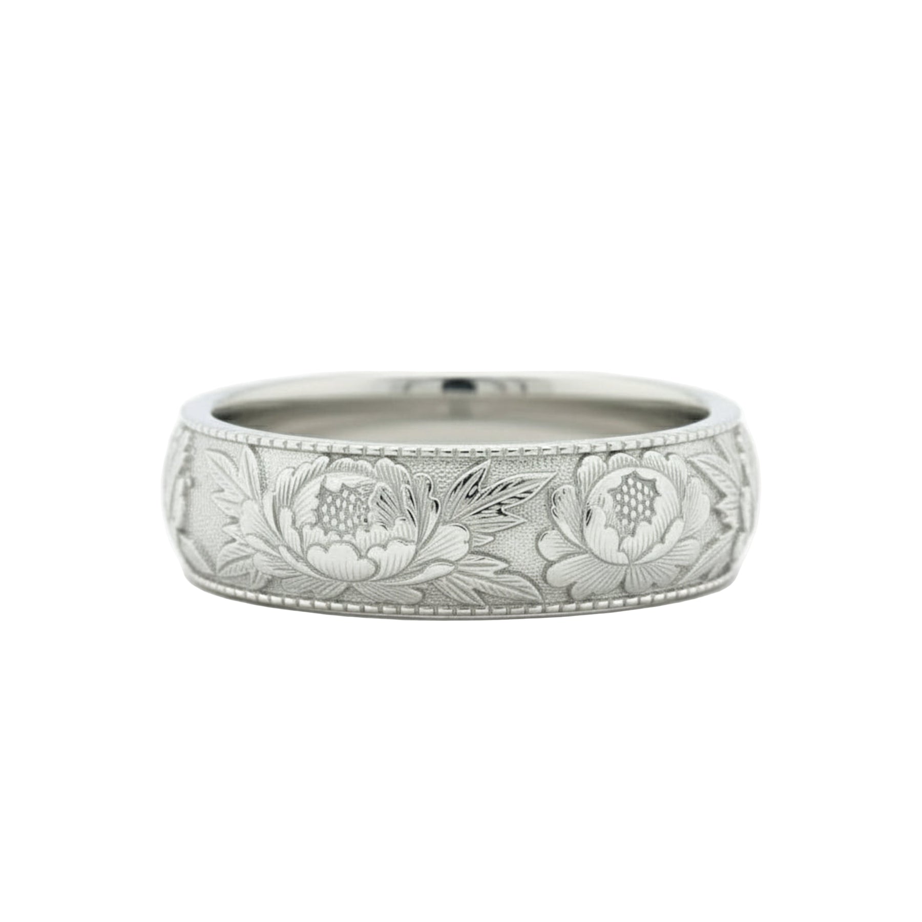 A beautifully detailed peony floral engraved wedding band with crisp, deep engraving and a classic botanical motif. The design wraps continuously around the ring, featuring full peony blooms, buds, and leaves set against a textured background for dimension and contrast.