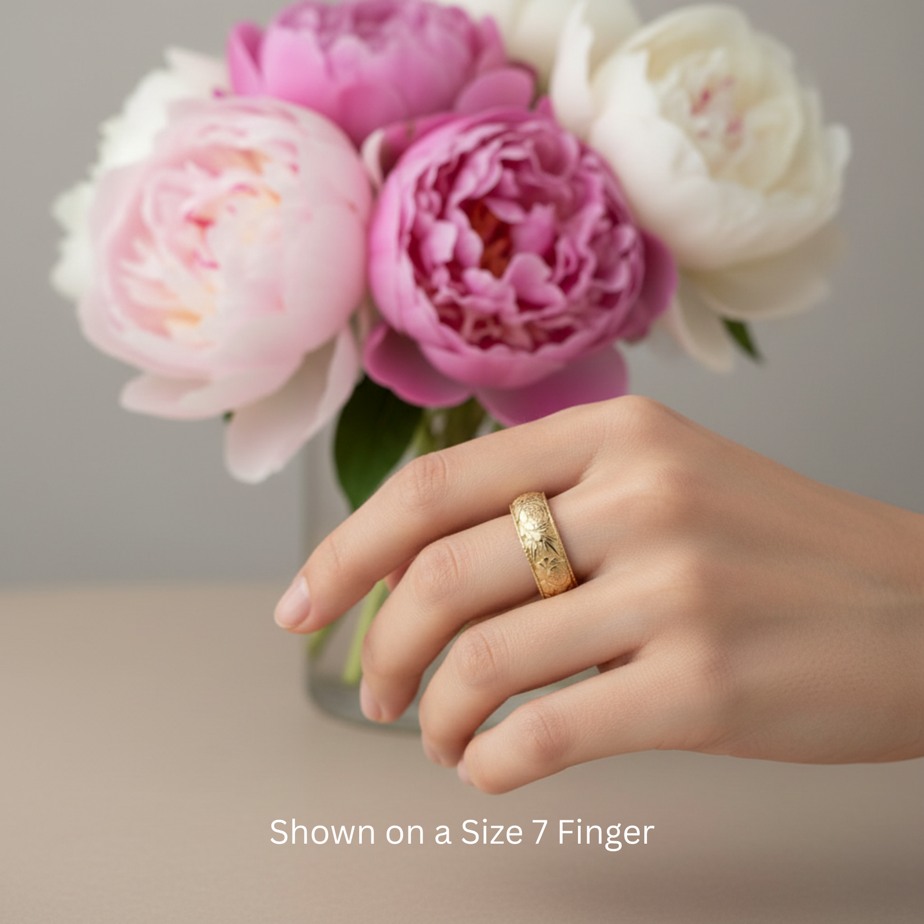 Peony floral engraved wedding band with detailed peony flower design shown on the hand, nature inspired botanical ring, 8mm wide band on size 7 finger | Rare Earth Jewelry