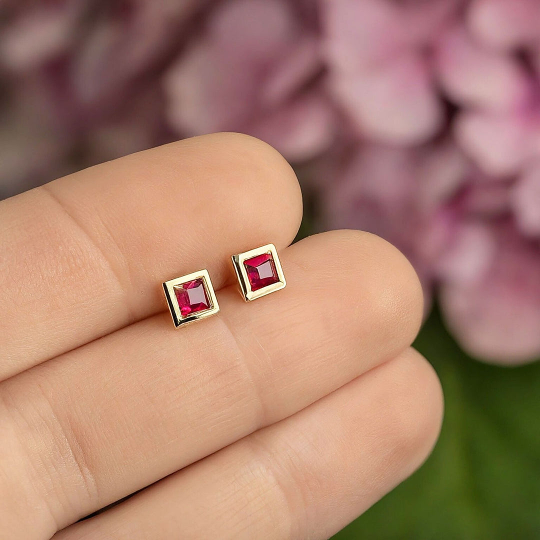 A pair of small square Ruby stud earrings in 14K Gold bezel settings.