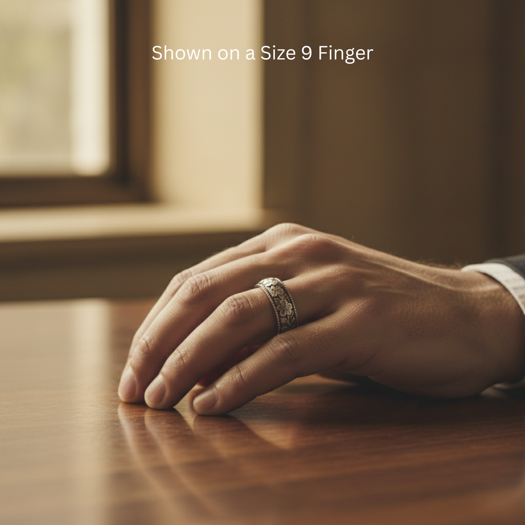 Because this is an 8mm wide band, many customers prefer ordering 1/4 to 1/2 size larger than their usual ring size for a more comfortable fit. If you’re unsure, I recommend trying a wide-band ring sizer or contacting me for help. If you'd like to see how an 8mm width looks on your ring size, I can provide a reference photo, just ask.